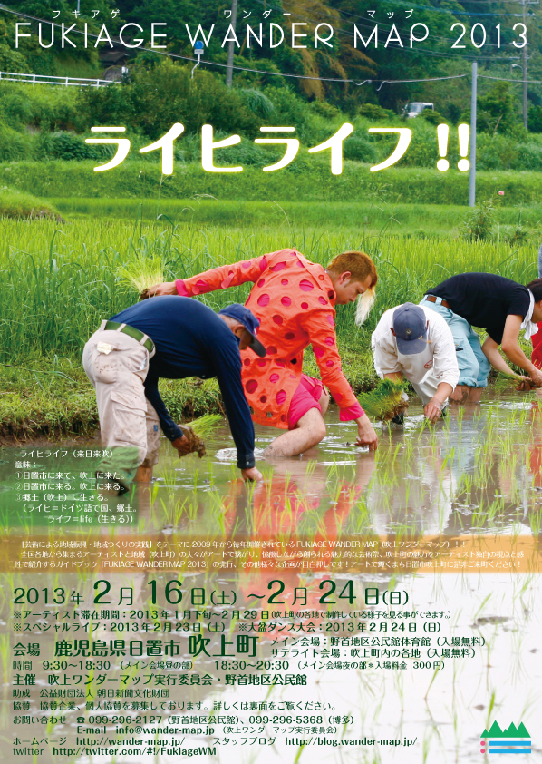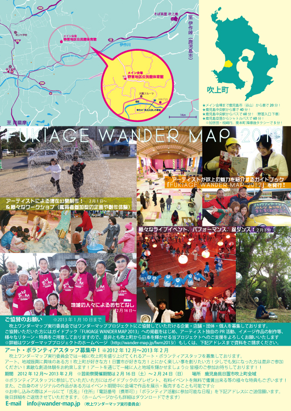 地域の魅力は「人」です。魅力的な人々が集まり、暮らす事で、魅力的な地域は生まれます。吹上ワンダーマップの主旨は「芸術(創造と表現)による地域振興、地域つくりの実践」なのですが、それはつまりFWMを通して吹上町の魅力を表現できる人間を内外に増やしていくと云う事です。また、アーティスト、地域住民、企業、行政が恊働して地域に新しい魅力(特色)を創造する事を促し、それを共有する事で自分達の地域を愛し、誇りをもてる「輝ける吹上町」をつくっていきたいと考えます。